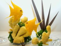 The pics from the Level 2 class move to the animal kingdom, featuring a lot of birds and fish (and an incredible giant bloom in half a watermelon). Interestingly, the seahorses seem to be made of a fruit or vegetable that looks very much like cookies & cream icecream, which is something I’ve always dreamed of, but never managed to find. Hats off to you, Chef Jimmy!