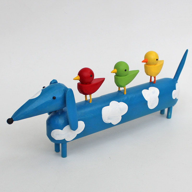 I’ll start with my favourite. This dog is made of painted, upcycled wood and stands about 4 inches tall and 11 inches long. The piece is called ‘Oh Happy Day’. And with this brightly coloured piece of magic in your home or office or classroom or shop, I’m tipping you’ll have a very happy day indeed. If you’re a deep kinda person, you can probably read something into the placement of the clouds, or the fact that the dog is happily supporting three animals of another species, all of different colours. But I just like it because it’s bright and cute.