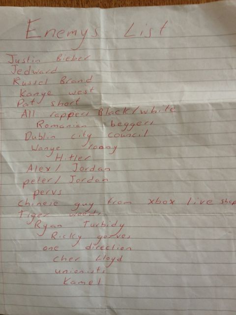 And one of my favourites – my lovely friends found this on the street near some fairly rough apartments here in Dublin (not today, but I couldn’t resist including it in this post). As you can see, it’s a comprehensive list of some kid’s enemies…hopefully he or she isn’t lost without it…