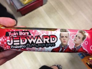 It’s a Jedward chocolate bar. A twin bar, to be precise. The side of the packet says, “FULL ON, CRAZY, JEADLEY!” Yes, really.