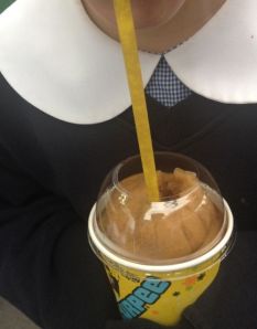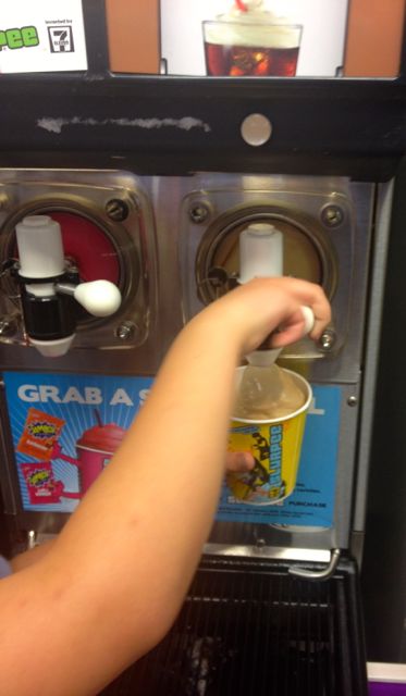 Even a cold, rainy day doesn’t stop us. Just pull your school jumper sleeves into Slurpee holders.