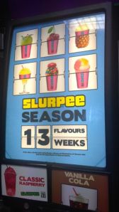 Anyways, these last few Mondays we’ve been on a mission. 7-Eleven is having a 13 week Slurpee promotion leading into summer. We’ve taken this as a 13 week challenge – there’s a different flavour of Slurpee each week. We missed the first week (Sour Watermelon) and last week, the machine was busted (Strawberry Citron, so nobody was too upset) and today was Vanilla Cola. Good times. I asked the man if he could let us in on the secret of next week’s flavour, but he said that he’d have to look it up on the system…and then turned away and smiled vaguely into the middle distance…