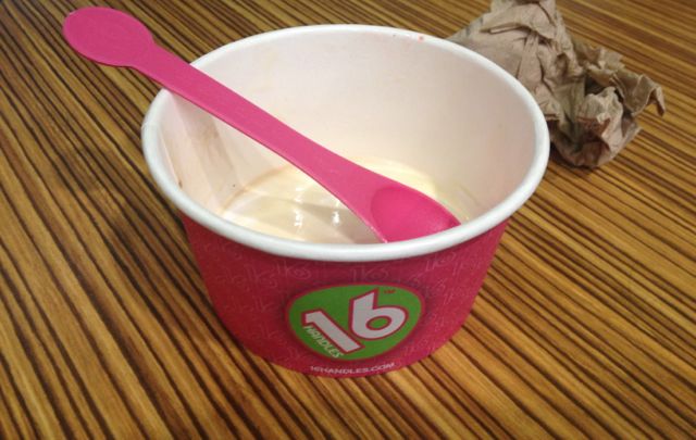 Really, I just like how people say fro-yo: a much cooler way to say frozen yoghurt, making it sound edgier and not at all like the low-fat alternative to ice cream. There are a few competing fro-yo chains here, but my cousin took me to the newest (and, according to most of the locals, the best) addition to the fro-yo scene here in NYC. It’s called 16 Handles, so can only presume they’re Molly Ringwald fans. Either that, or they are just very literal folk – there did appear to be 16 flavours of fro-yo.