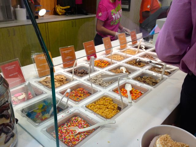 I’ll let the creators explain what it’s all about, this “hands-on revolution”: 16 HANDLES is mixing things up and at the center of our frozen playground is you: an uncontainable, independent champion of your own taste. More of this, less of that—you want frozen yogurt your way and we’re all about it. With 16 rockin’ kosher certified flavors on tap daily, we provide you with a twisted canvas, your own fat-free backdrop of calcium, protein and probiotic goodness. At our mammoth toppings bar, you’ll find a world of possibilities, from wholesome berries to decadent sauces, that you handcraft into something uniquely yours. Welcome to the hands-on revolution.