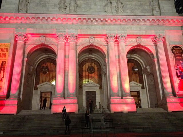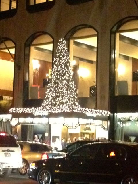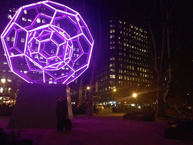 Good night, Time Warner Center. I couldn’t really catch your beautiful colour-changing lights here, but you know you’re gorgeous. And you’re one of my favourite places to soak up the hustle & bustle of NYC.Good night, random festively dressed hotel on Central Park. You look very pretty. And kind of like you’re wearing a fairy light witch’s hat…Good night, Public Library. You are such a beautiful building and you look very cool with your fancy coloured lights.Good night, Harry Winston. Your festive lights look as lovely as the jewellery that you sell. Like very classy diamond accessories for your building, as it were.Good night, Buckyball. You’re a fabulous colour-changing installation at Madison Square Park and you’ve even brought your own ‘zero gravity’ curved benches, so that viewers can lie back and marvel at your cleverness. And you make the wait for burgers at the Shake Shack much more fun.