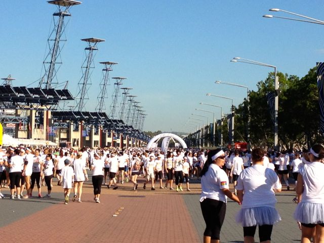 What a fantastic day we had – arriving at Sydney Olympic Park with tens of thousands of peeps of all ages, shapes and sizes, while most of Sydney was still in bed on a lazy Sunday. Passers-by must have thought there was some sort of cult gathering, as everyone was dressed in white – some with crazy wigs, angel wings or colourful socks and shoes to help them stand out from the crowd. Thanks to the awesome eagle-eyes of the youngest Steph in our gang, we somehow managed to meet up with everyone at the starting area. And then we waited. Standing in the sun, already roasting hot before 9am, as they released runners in waves from the crowd of thousands that were in the queue.