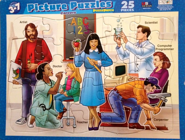 We had a family party on the weekend and, as I was packing away the puzzles that the younger kids had been playing with, I noticed one aspirational puzzle entitled Careers. As I checked out the range of career options that our kids were being shown, I could not help but notice that the ‘Artist’ looked suspiciously like Jesus. Oh, and also like he has A PENCIL COMING OUT OF HIS HEAD, but that is really secondary.
