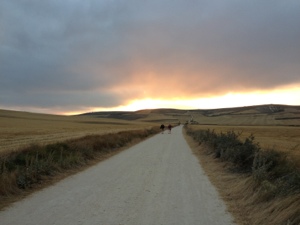 Another fine day for us today – entering the Meseta part of the Camino (which Dave tells us means ‘table’, in recognition of it being a long, flat plain). We set a good pace, stopping for breakfast at a cute albergue along the way, complete with medieval-ish round table and lighting. We were joined for breakfast by Nick and Jim, a father & son from Alice Springs in Australia (or, as Jim so eloquently put it when introducing himself: ‘from the middle of f*#%ing nowhere’). These two were actually the first people I haven’t warmed to on the Camino – they didn’t seem interested in giving genuine or thoughtful answers to questions (as all other pilgrims have done), but were full of smarty pants one-liners and it was as if they were playing the roles of big-drinkin’, swearin’, stirrin’ Aussies from the desert. The dad, Nick, claimed this was his fifth Camino – although it sounds as though he does much of his walking by bus or taxi between main towns. I guess it takes all types and we have certainly met a lot of different folk thus far on the Camino, but these were two peeps I was not sad to leave behind.