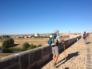 After a good night’s sleep (my first for this trip) in Leon, we walked along an extremely mind-numbing and slightly depressing part of the Way to Villadangos del Paramo. Walking alongside the highway in the hot sun, with no real landmarks along the way, I was hit with a new physical challenge: a crippling pain in my right shin that was so intense it stopped me from taking a step on a few occasions.