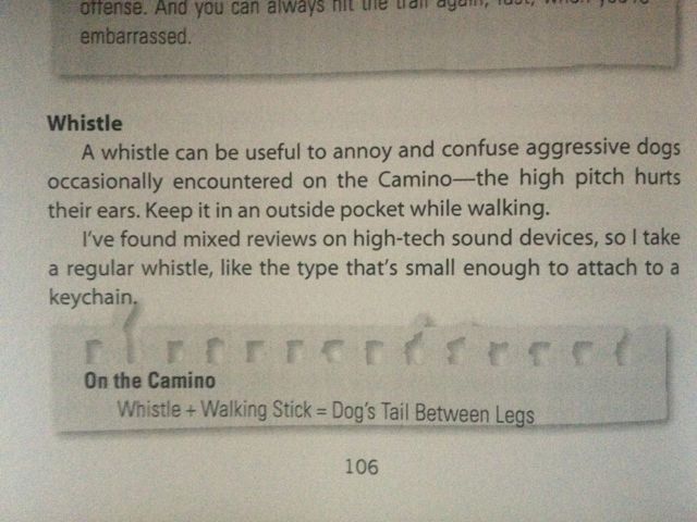 Just look at that dude on the cover, trotting along the Way, with a little bird helping lift the burden of his (already tiny) backpack. Happy days on the Camino, yes? Well, not every day, if page 106 of this book is to be believed. I’m off to buy a whistle. Or a high-tech sound device.