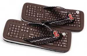 I first saw a version of these amazing Keyboard Slippers on the Inventor Spot site and thought they were pretty cool. Well, cool mightn’t be quite the right word. The original slippers are made by Kito in Thailand and you can get lots of different coloured foot straps: black, yellow, red, orange, brown or dark blue (depending on which of your geek chic outfits you want to match). Launched early last year, the Kito originals cost about $30 and are shipped worldwide from Thailand.